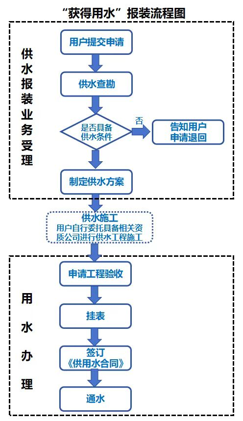 (二)用水辦理(1天):工程驗收、掛表、簽訂《供用水合同》、通水。